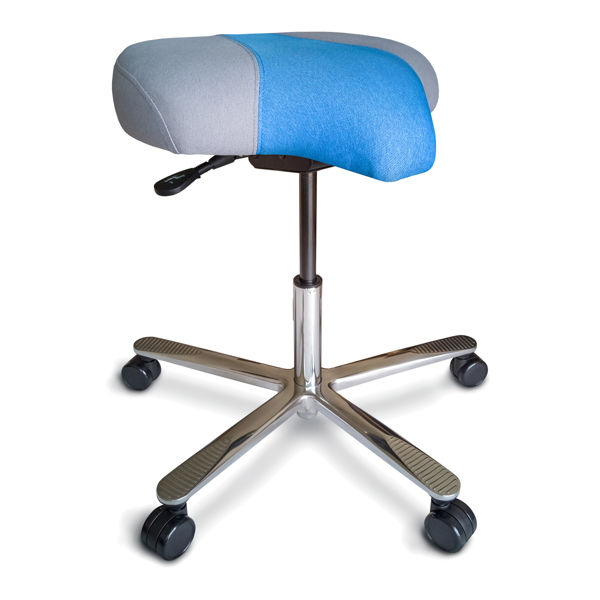 Sitting in a saddle chair places you into a tripod-like position, with a triangle forming between your abducted legs and the chair stem. This is a very strong position to work from with both of your feet placed firmly on the floor giving you greater balance. Your legs are also bearing most of your body weight which helps minimise pressure on the rest of your body.