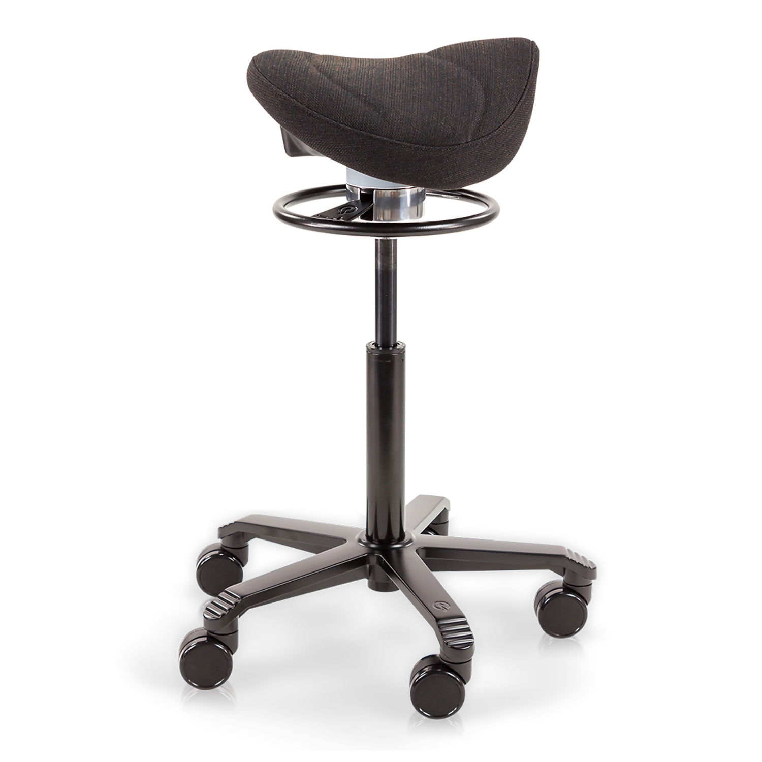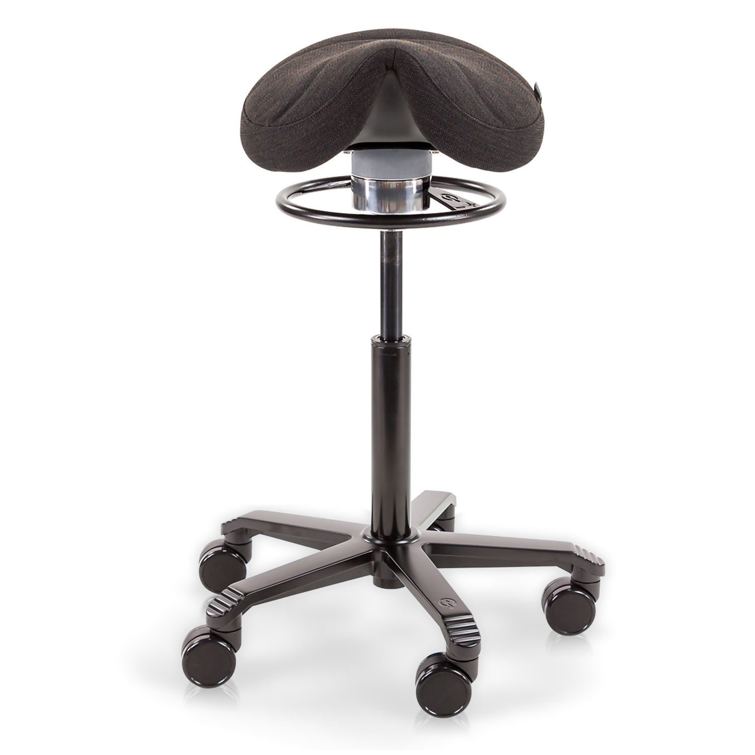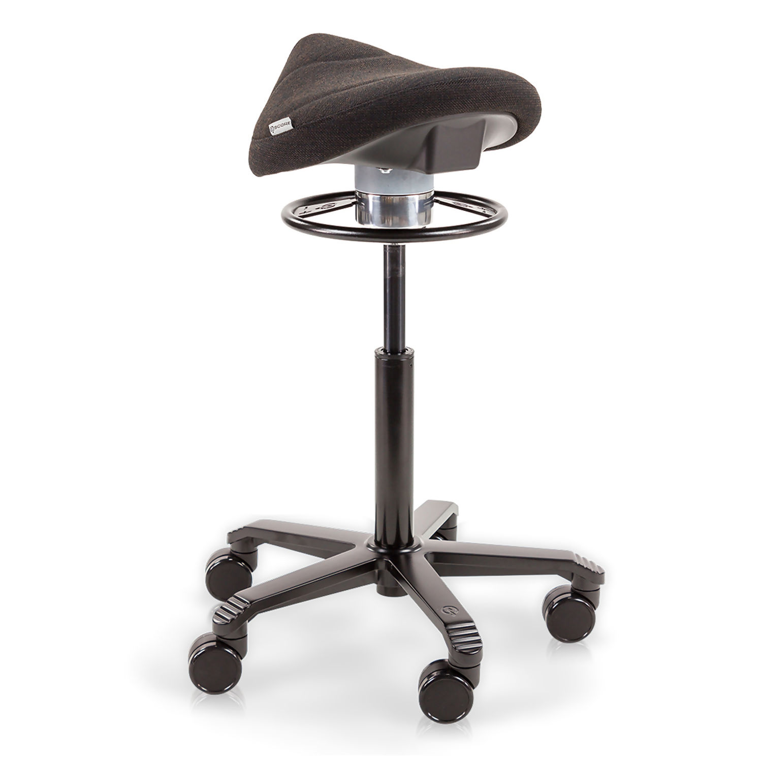 Sitting in a saddle chair places you into a tripod-like position, with a triangle forming between your abducted legs and the chair stem. This is a very strong position to work from with both of your feet placed firmly on the floor giving you greater balance. Your legs are also bearing most of your body weight which helps minimise pressure on the rest of your body.