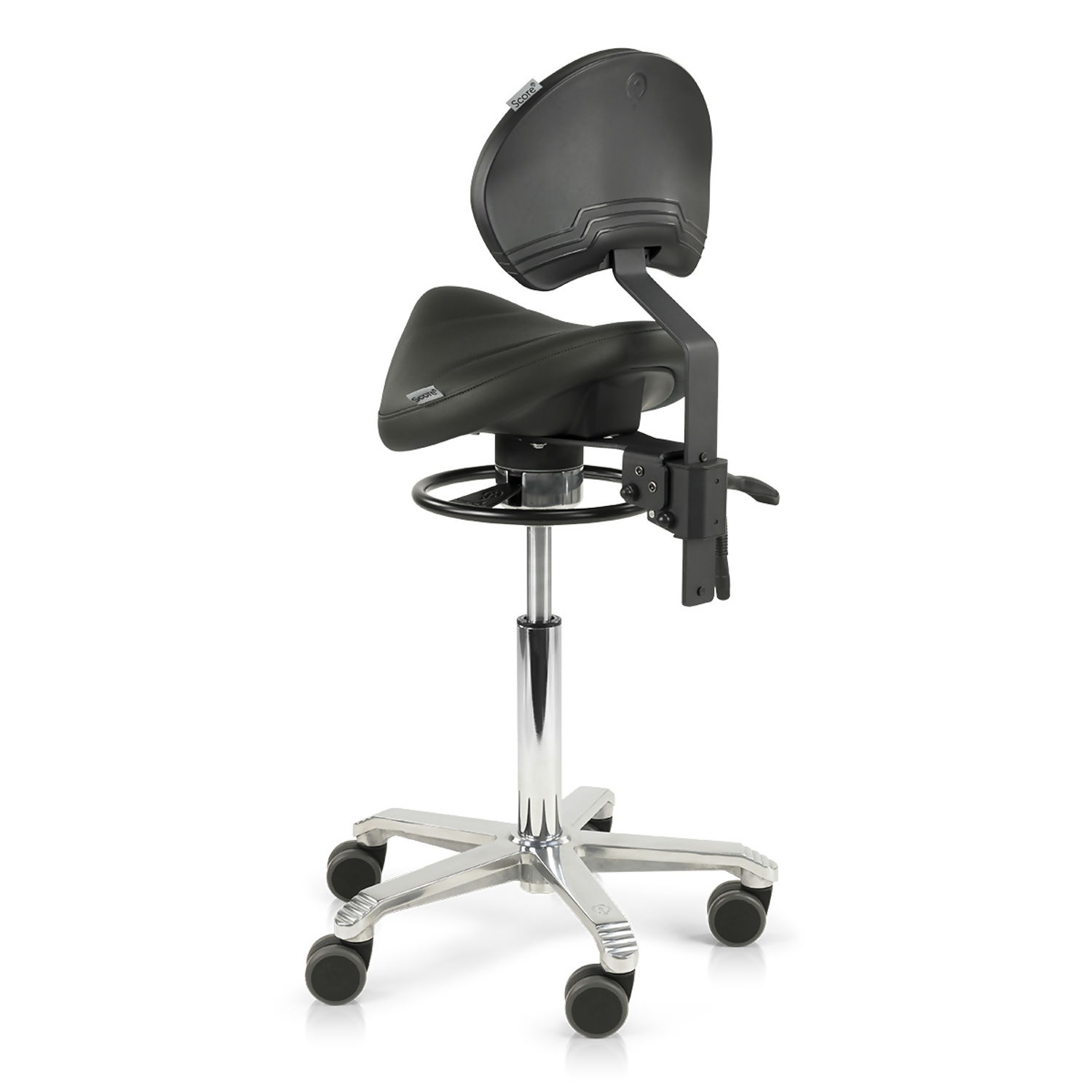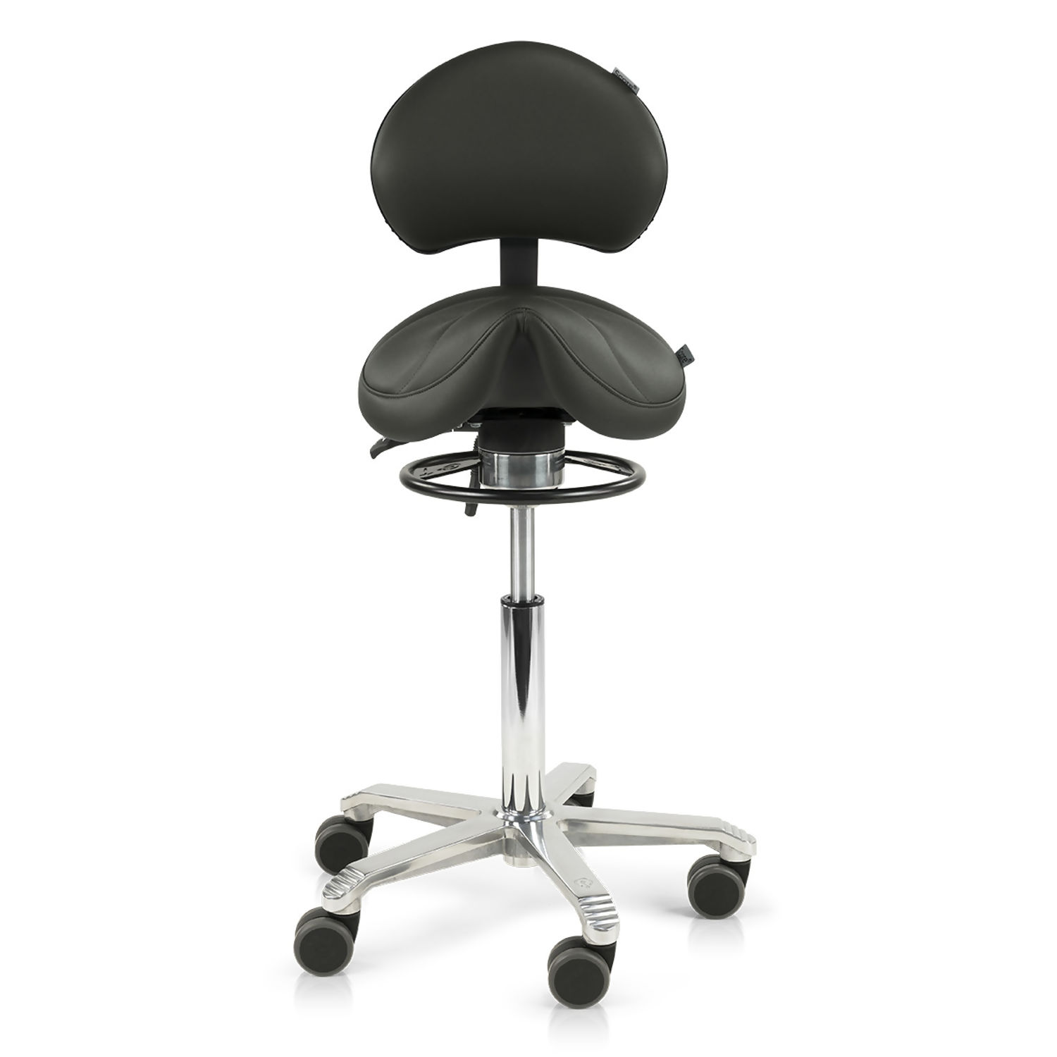 Sitting in a saddle chair places you into a tripod-like position, with a triangle forming between your abducted legs and the chair stem. This is a very strong position to work from with both of your feet placed firmly on the floor giving you greater balance. Your legs are also bearing most of your body weight which helps minimise pressure on the rest of your body.