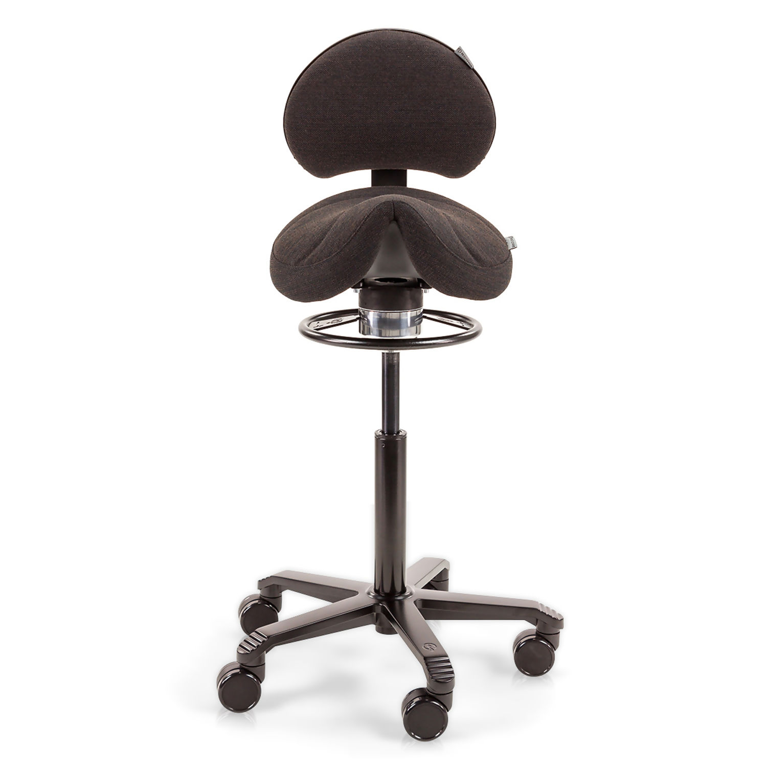Sitting in a saddle chair places you into a tripod-like position, with a triangle forming between your abducted legs and the chair stem. This is a very strong position to work from with both of your feet placed firmly on the floor giving you greater balance. Your legs are also bearing most of your body weight which helps minimise pressure on the rest of your body.