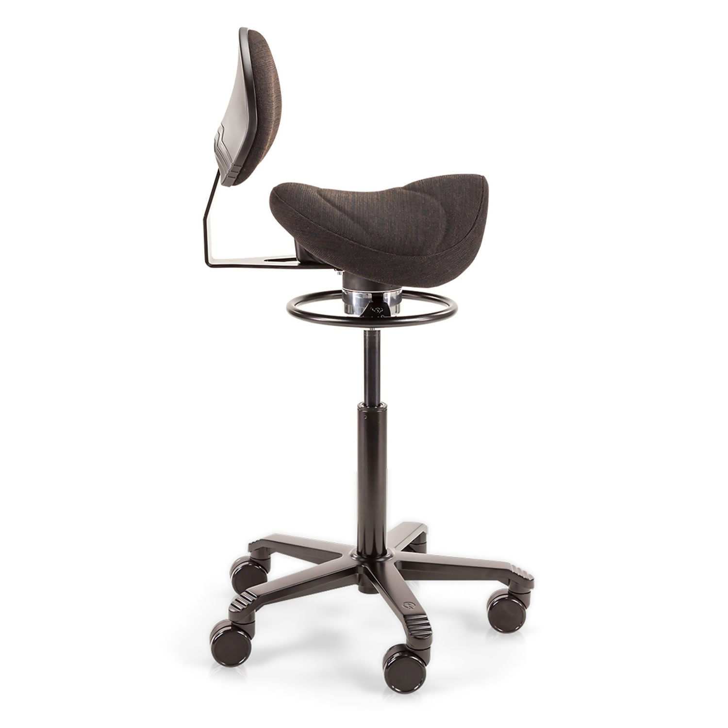 Saddle chairs encourage active sitting, with minimum exertion required to transition between sitting and standing. Movements are made from the hip, rather than the midriff, which allows you to flex further and easier. Manoeuvring around on your stool is also simplified because you are engaging the larger muscles of your upper legs, rather than the calfs.
