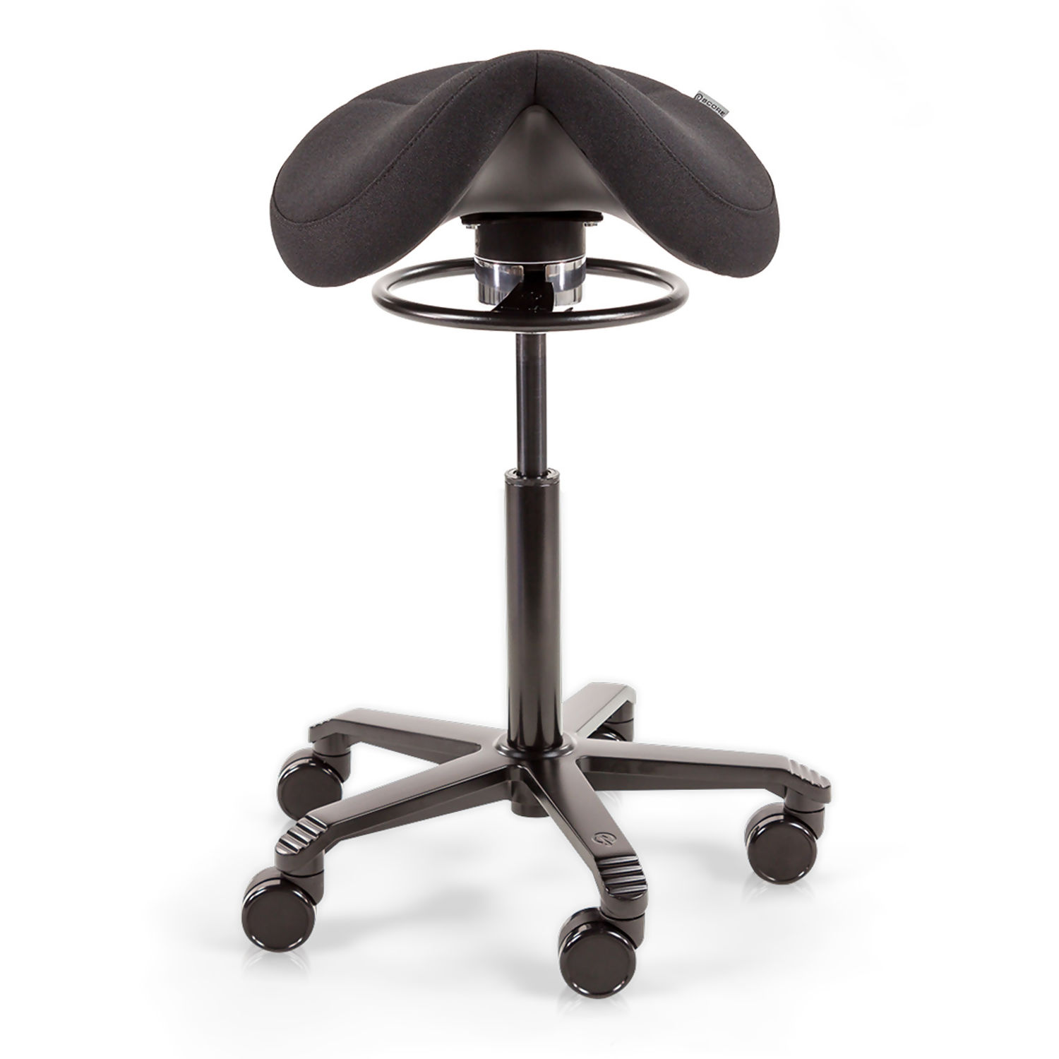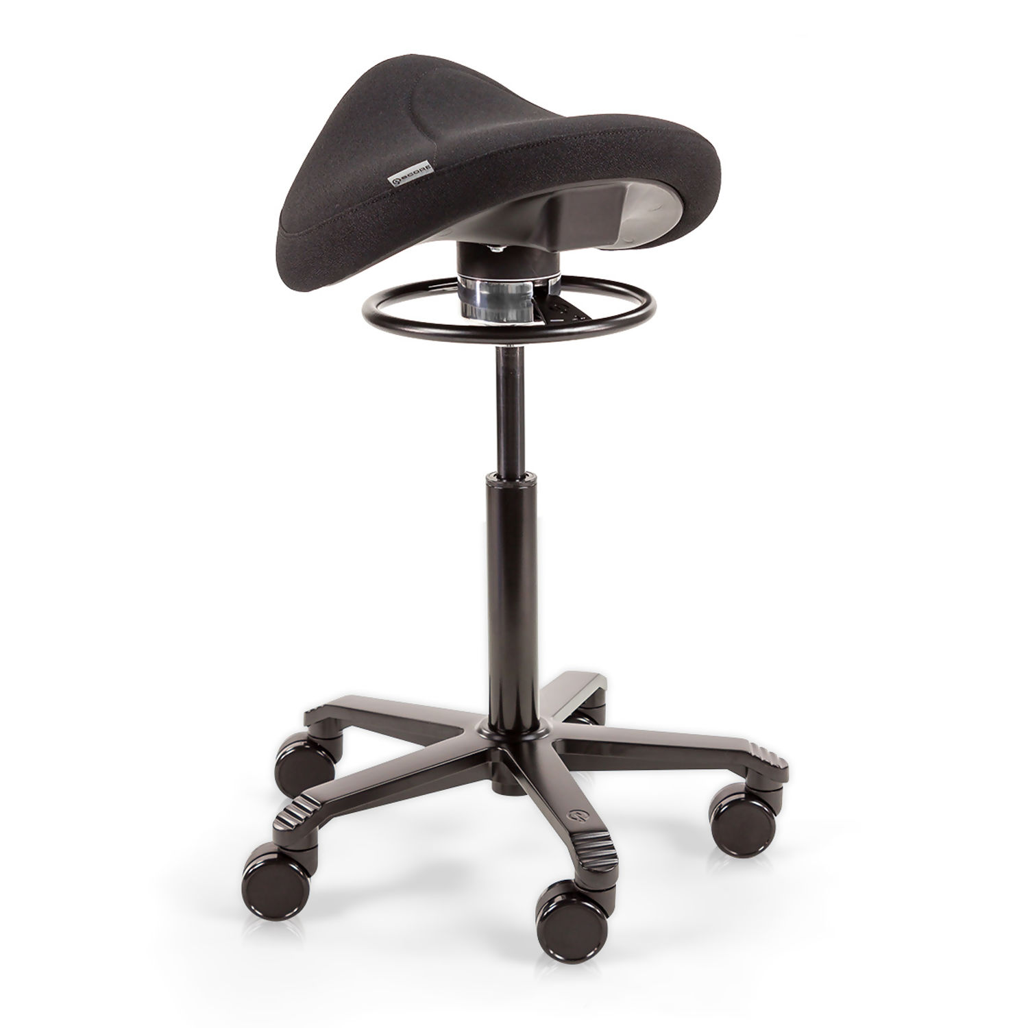 Sitting in a saddle chair places you into a tripod-like position, with a triangle forming between your abducted legs and the chair stem. This is a very strong position to work from with both of your feet placed firmly on the floor giving you greater balance. Your legs are also bearing most of your body weight which helps minimise pressure on the rest of your body.